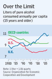 The U.K.'s problem is especially striking because of the contrast to what's been happening in many other industrialized nations. Per-capita consumption of alcohol in the U.K. rose 19% between 1980 and 2007, compared with a 13% decline for all 30 countries in the Organization for Economic Cooperation and Development, according to the most recent data. Average consumption over that period fell by about 17% in the U.S., 24% in Canada, 30% in Germany and 33% in France, according to the OECD.